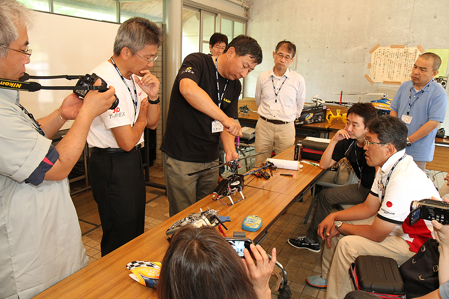イベントにはT-REX開発に深くかかわりT-REXをよく知る蔡鴻仁氏をはじめ、T-REXの技術的なことはもちんフライヤーとしても優れた腕を持つ周瑞麟氏、ラジコンヘリの知識があって日本語も堪能な陳清南氏の3名が来日。さらにヒロテックでT-REXの技術サポートを行っている小林学氏も加わった講師陣が、参加者に説明していきます。