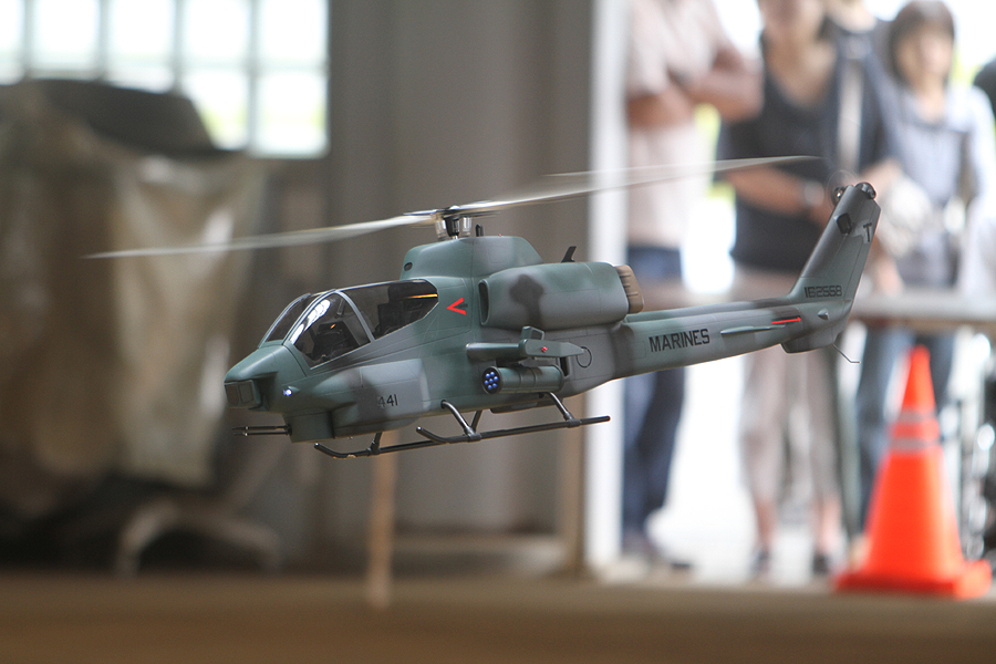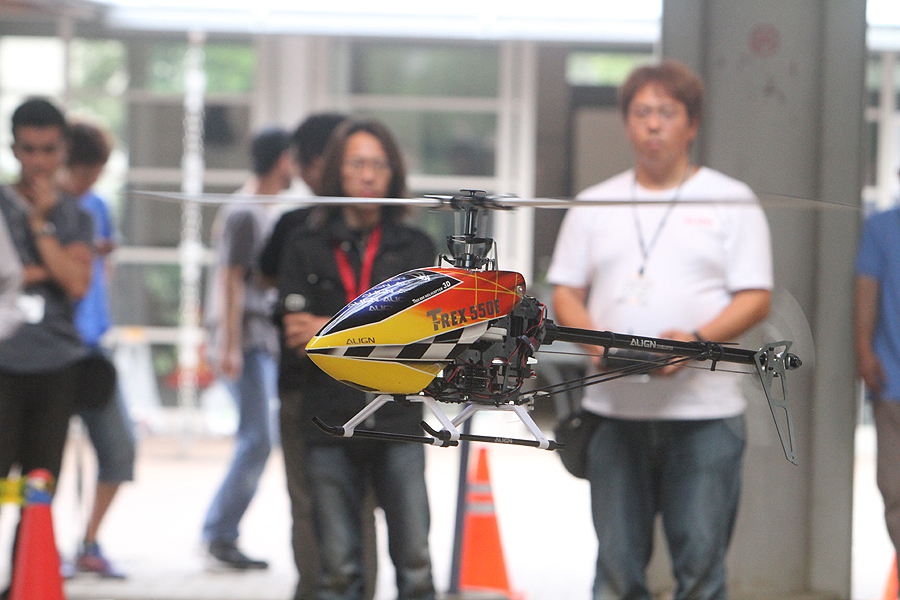 T-REX調整についての解説が終わると、午前中のプログラムが終了。昼の休憩では、小林氏によるスケールヘリ「AH-1コブラ」のデモフライトや周氏によるT-REX 450での3D演技が披露されました。また、ヒロテック契約フライヤーの岡聖章選手が、新製品のホバリング調整済みRTFヘリ「T-REX 450 PLUS」をその場でパッケージから取り出してすぐにフライトするデモも。まさにReady to Fly(RTF)の言葉そのままの製品は初心者におすすめです。