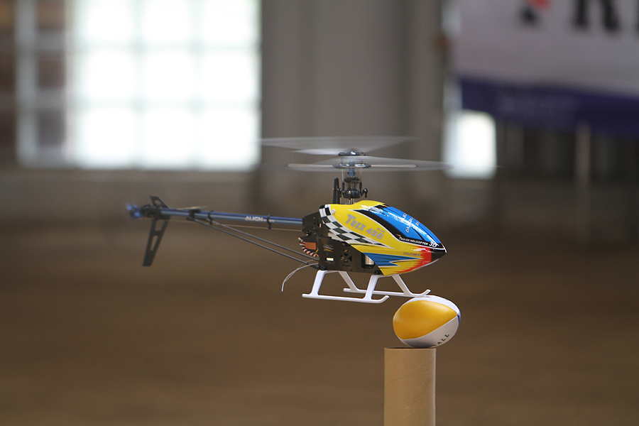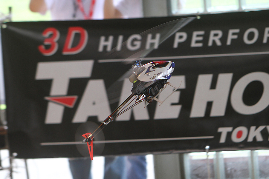 屋根のある限られたエリアでも周氏がT-REX 450で3D演技を披露。